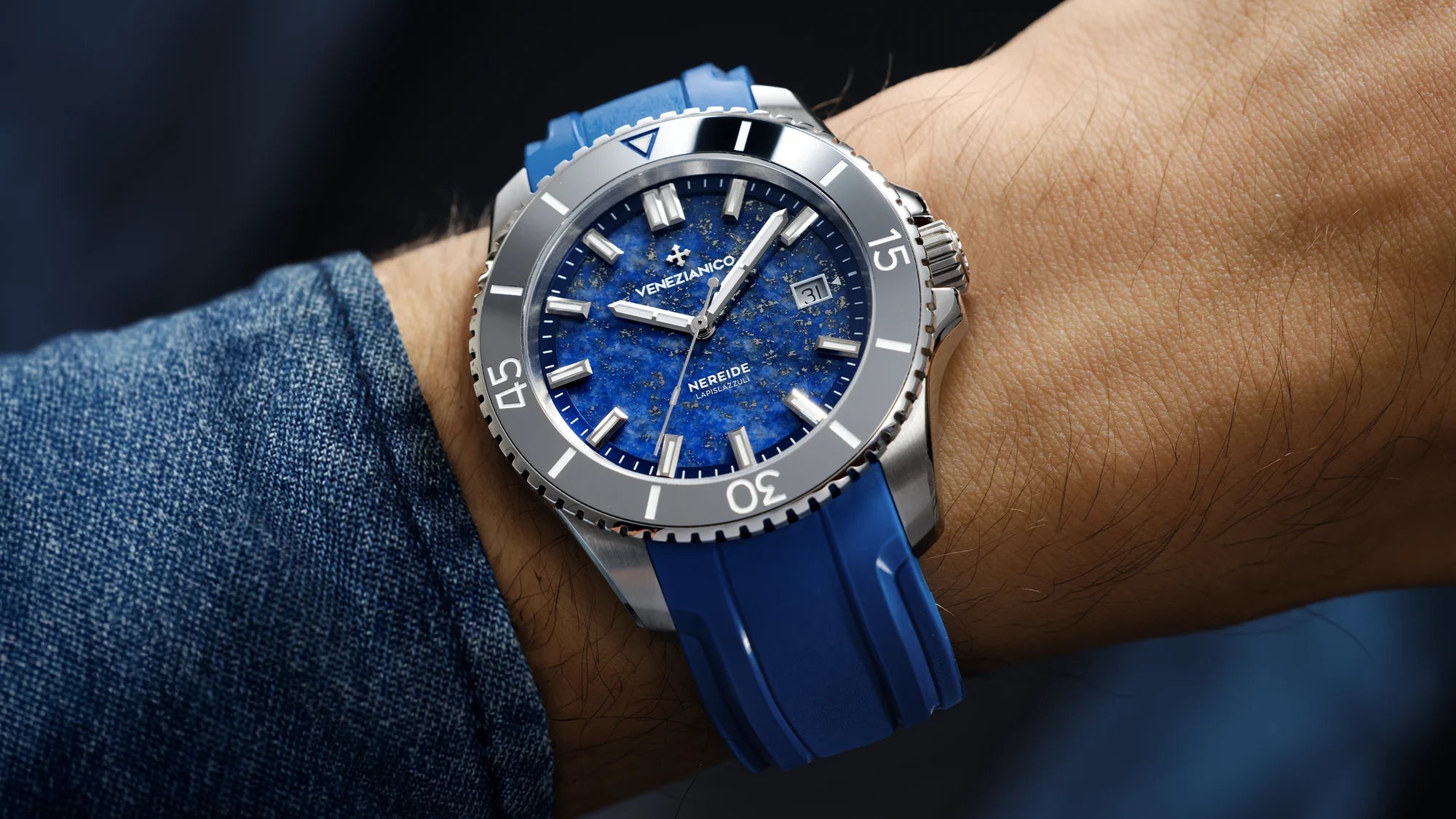 Nereide Lapislazzuli combines Venetian tradition with materials of exceptional value. The lapis lazuli dial, known for its intense blue and symbol of nobility, carries a millennia-old history. The robust case and tungsten bezel add strength and durability, creating a perfect balance between ancient art and innovation.
