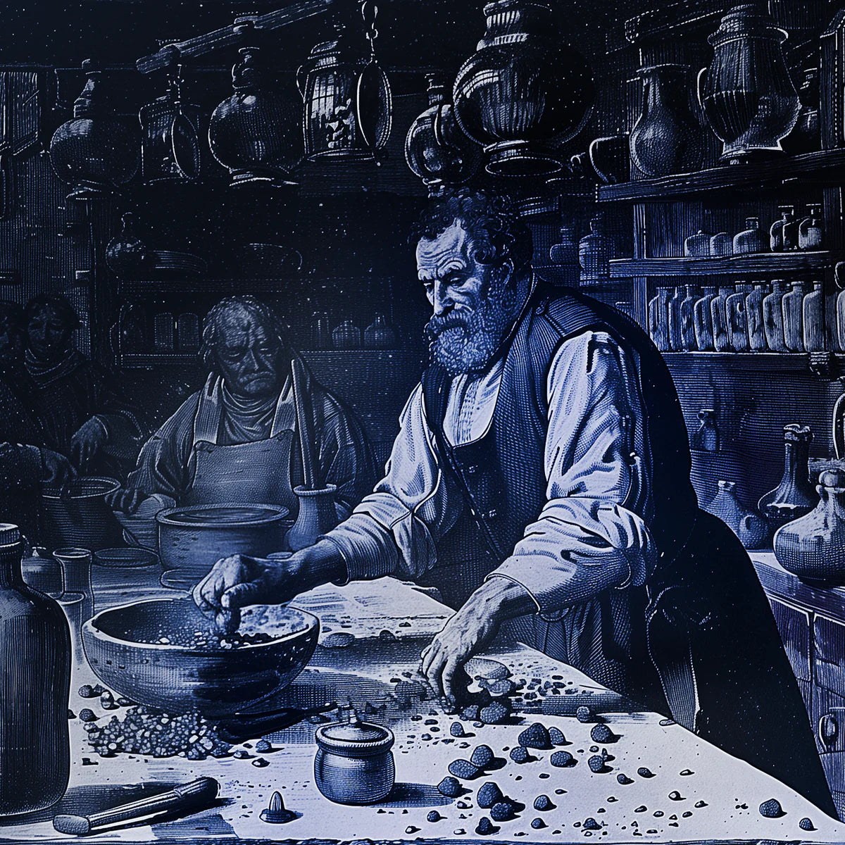 Lapis lazuli, known for its deep blue, was used to produce ultramarine, a pigment valued for its beauty and durability. The process was complex: raw lapis lazuli was crushed in a stone mortar and then ground into a fine powder. This powder was mixed with water and binding agents to create a paste, which was then washed to remove impurities and isolate the pure ultramarine pigment. The result was an intense and brilliant blue, used in medieval and Renaissance sacred art.