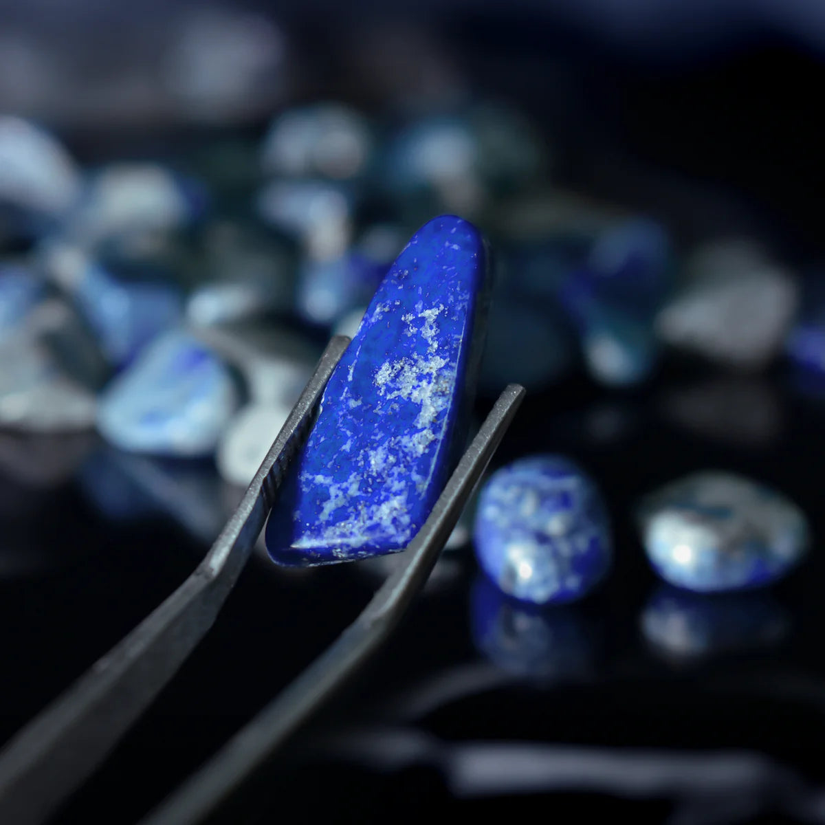 Lapis lazuli is a vibrant blue gemstone with sparkling pyrite veins and a granular texture. Its shades range from light to dark blue, and inclusions of calcite or other minerals add to its unique beauty, making it prized in jewelry and decoration. In this creation, the stone is meticulously cut into an ultra-thin layer of just 0.4mm—a highly complex process that requires exceptional precision and craftsmanship.