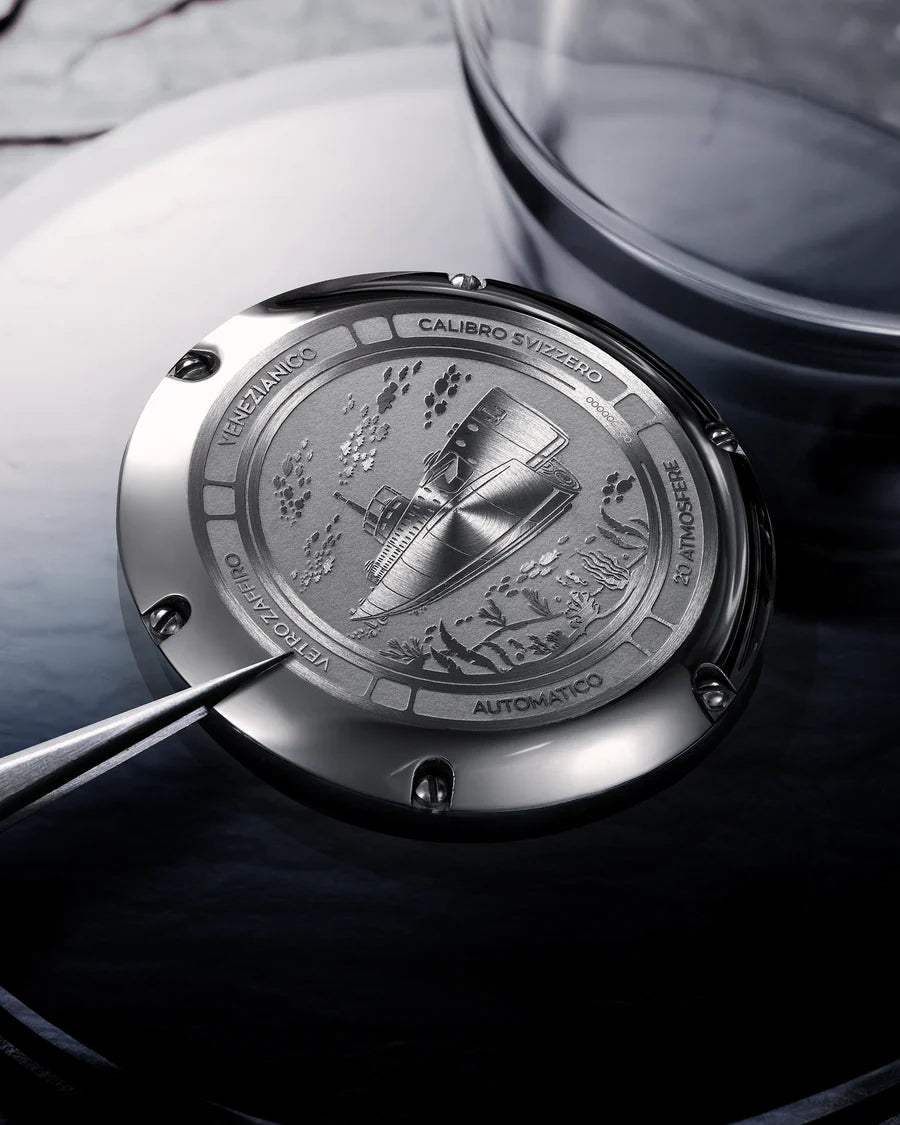 The submarine Nereide, which inspires the entire collection, is depicted submerged in the engraving at the center of the caseback, to remind how this watch doesn't compromise on underwater performance, retaining the ability to dive up to 200m deep and the rotating bezel that allows monitoring of dive times.