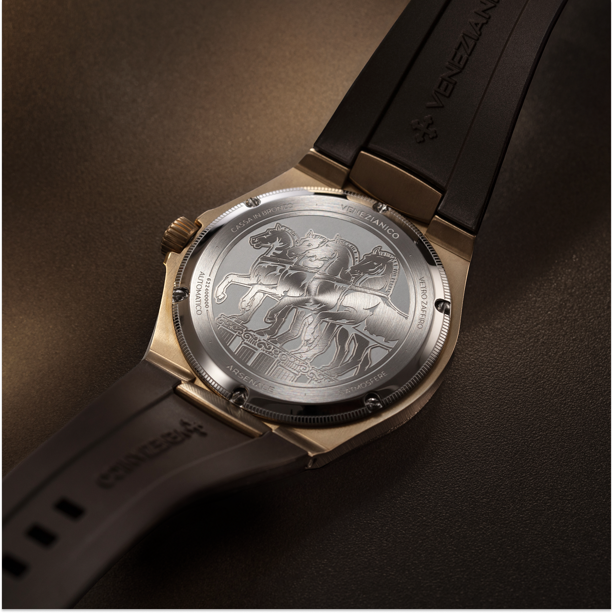 The caseback of the Arsenale Bronzo is not just a technical element, but a true decorative surface that tells the story of Venice through its details. Crafted in 316L steel, it creates a sharp and refined contrast with the warm, ever-changing tones of the bronze case. The engraving of the Horses of St. Mark comes to life through a combination of sandblasted and radial satin finishes, enhancing the three-dimensionality of the figures and infusing the scene with movement.