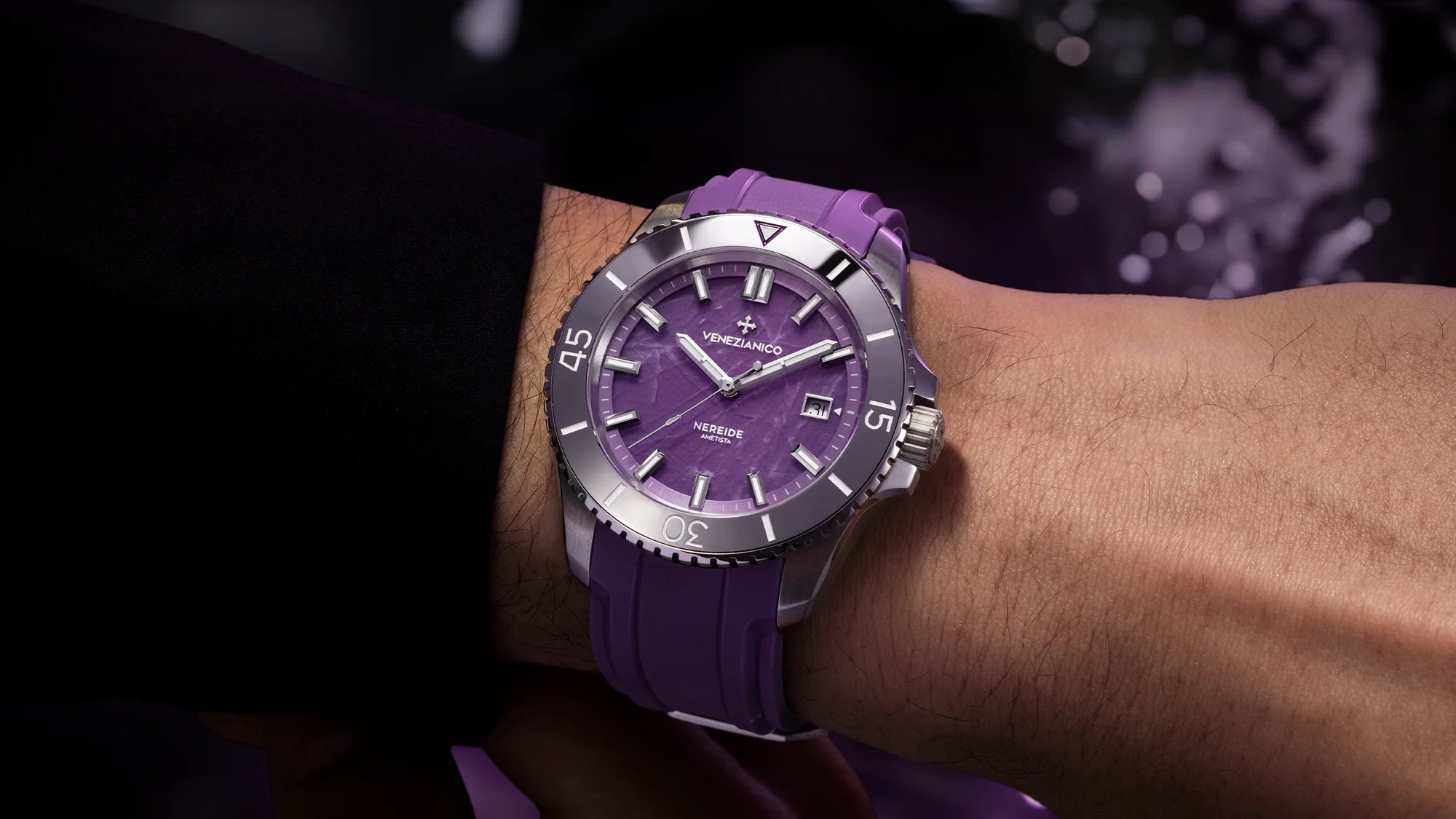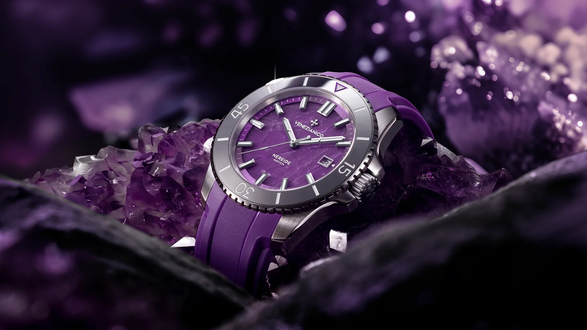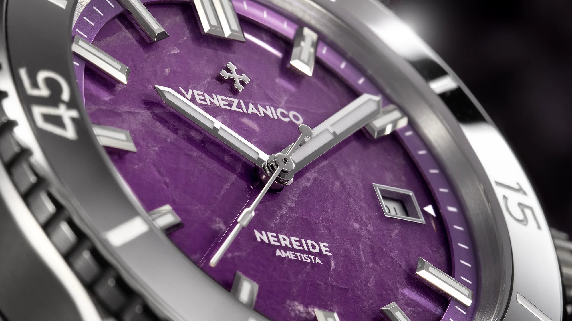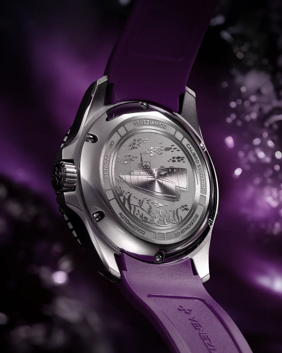 Nereide Amethyst blends the rich Venetian artisanal tradition with experimentation in contemporary materials. In addition to the precious dial, it stands out for the use of a tungsten bezel, an indestructible metal known for its excellent mechanical properties and durability.
