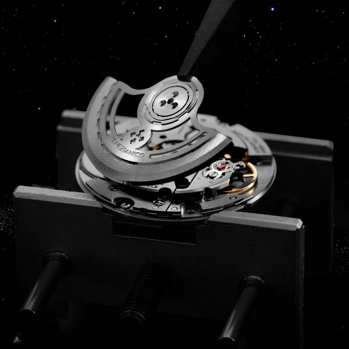 Produced in the Swiss facilities of Soprod SA, the V3250 is an automatic movement based on the M100 caliber architecture. The elaborate skeletonization of the new rhodium-plated rotor—designed to further enhance the movement's details—contrasts with the essential sandblasted decoration of the bridges, making the V3250 a movement with a refined and modern aesthetic.