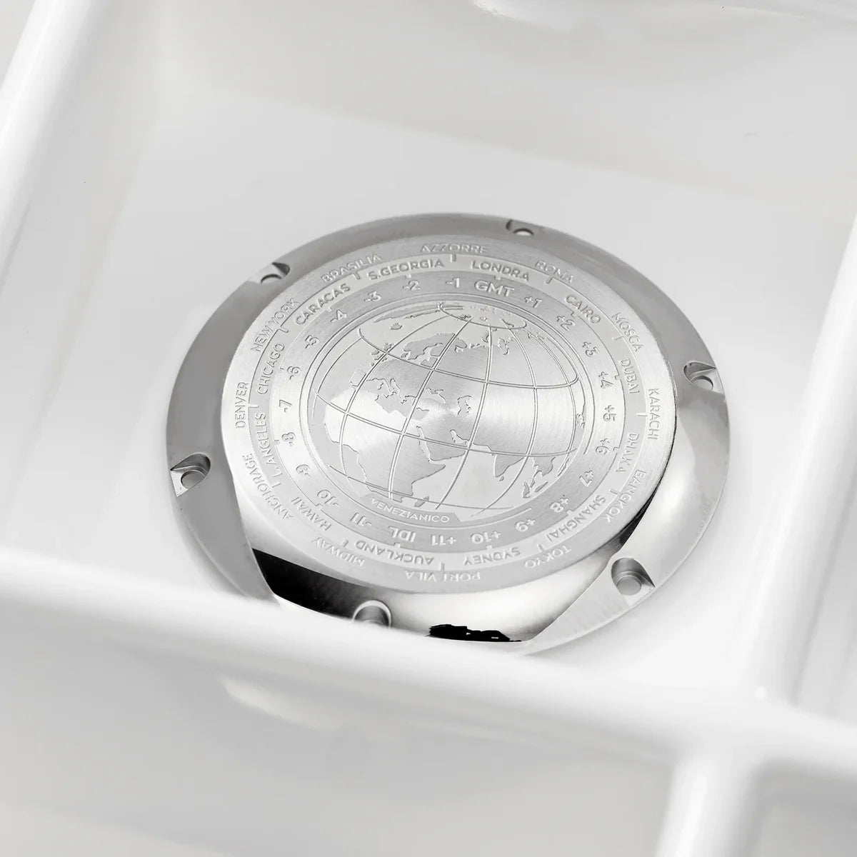The finely engraved caseback celebrates the adoption (for the first time in 1884) of the 24 time zone system as a global reference time system based on Greenwich Mean Time. Around the representation of the terrestrial globe, the major cities of the world are shown next to their respective time zones. This way, you can set the time zone in the traditional way without needing your smartphone.