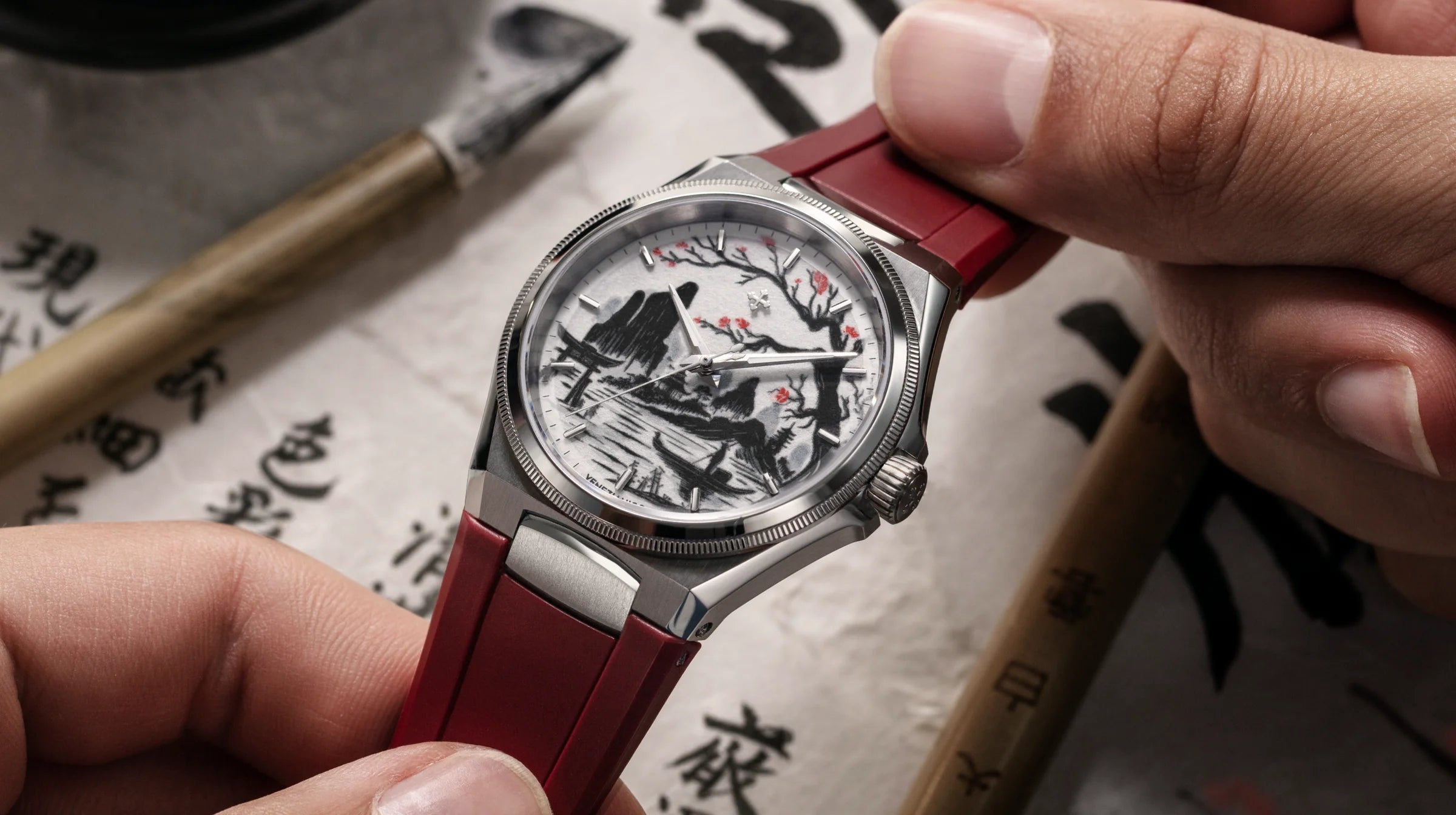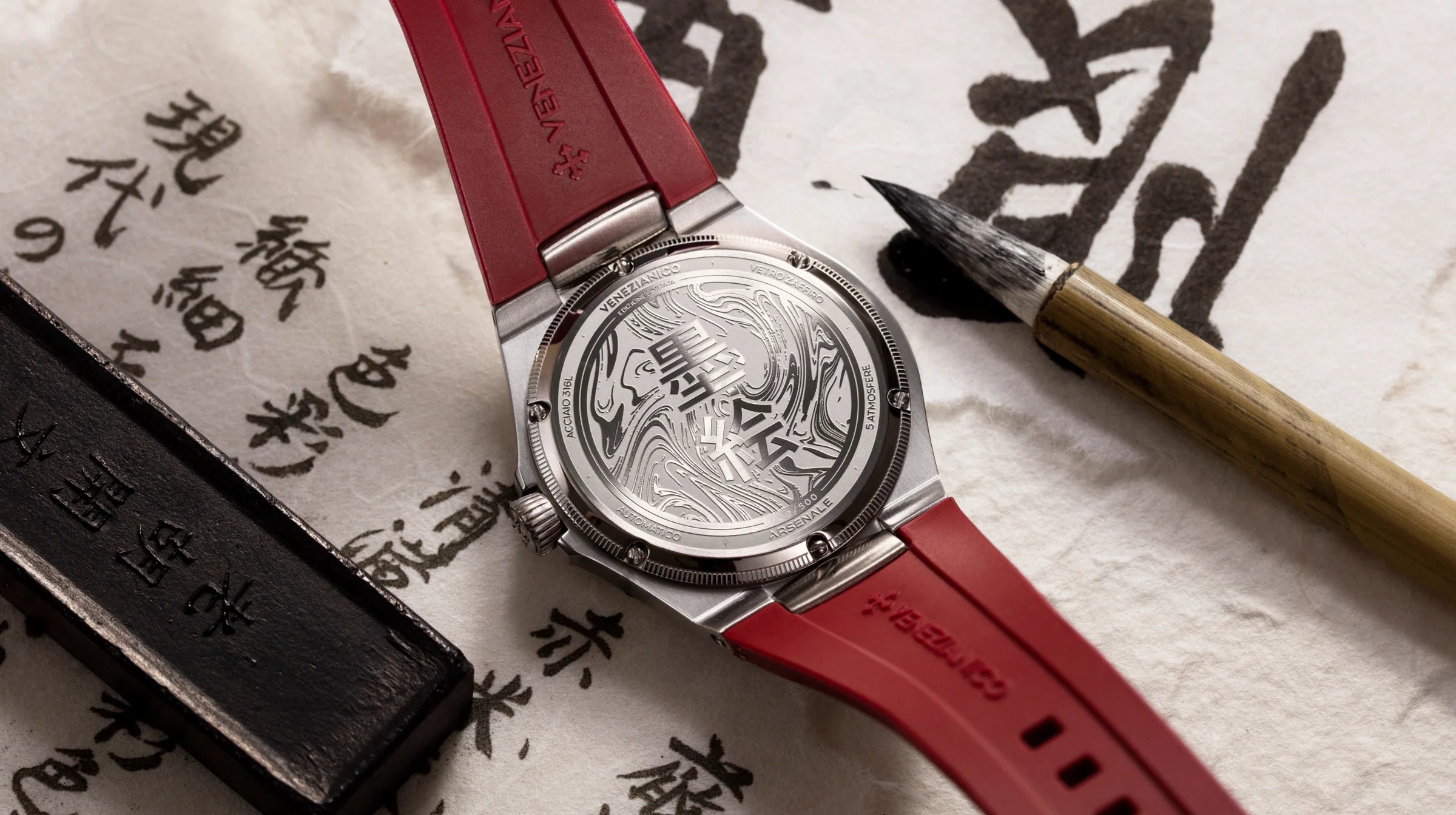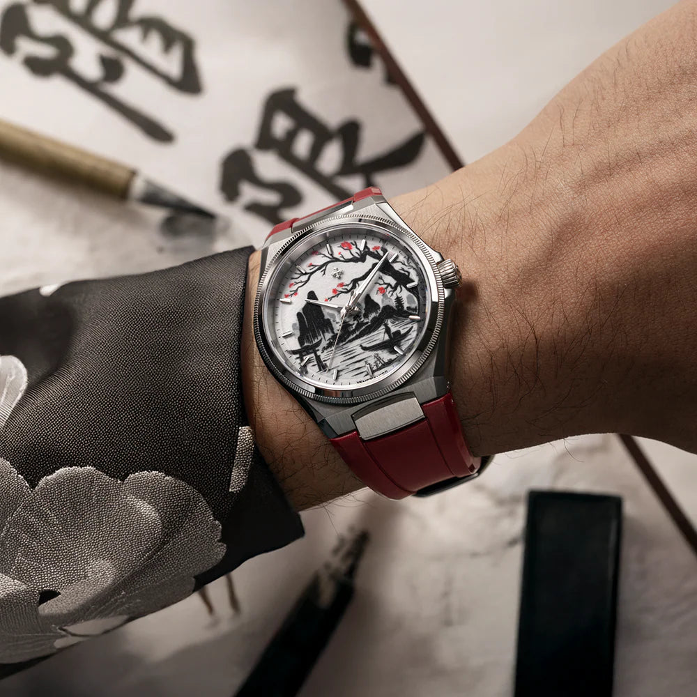 On the caseback, the Japanese characters 墨絵 (Sumi-e) are engraved, identifying the painting technique that inspired the model. Around them, an engraved motif evokes ink dissolving in water — a symbol of balance and harmony between gesture and material. The fluid lines and depth of the engravings create a dynamic, vibrant effect, recalling the movement of the brush across the paper. At the bottom appears the progressive numbering from 1 to 500, highlighting the uniqueness of each piece.