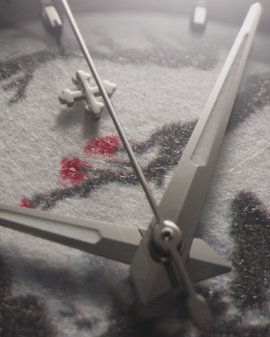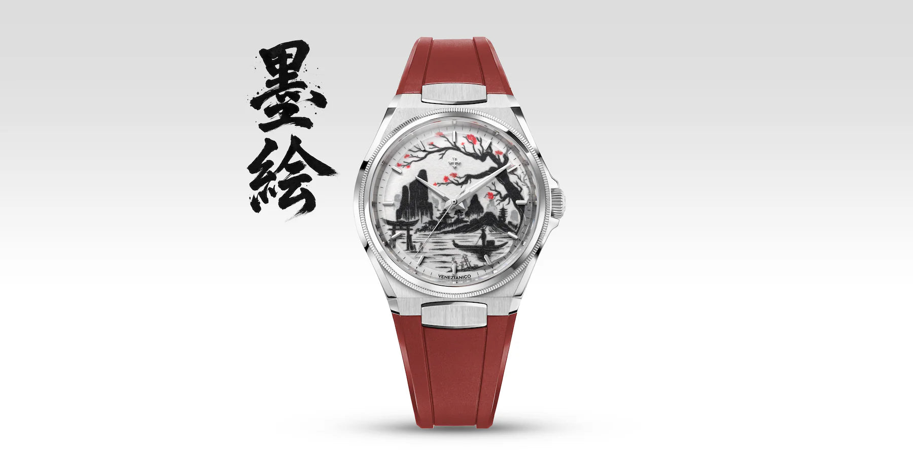 To accompany the watch, a dedicated box has been created that reflects the visual language of the dial, extending the project’s aesthetic beyond the object itself. The surface is decorated with a motif inspired by the original design, reproduced in high definition to preserve the shades and contrasts typical of the Sumi-e technique. On the underside, a short inscription in English and Japanese tells the story behind the concept and the dialogue between art, culture, and technique that guided its development.