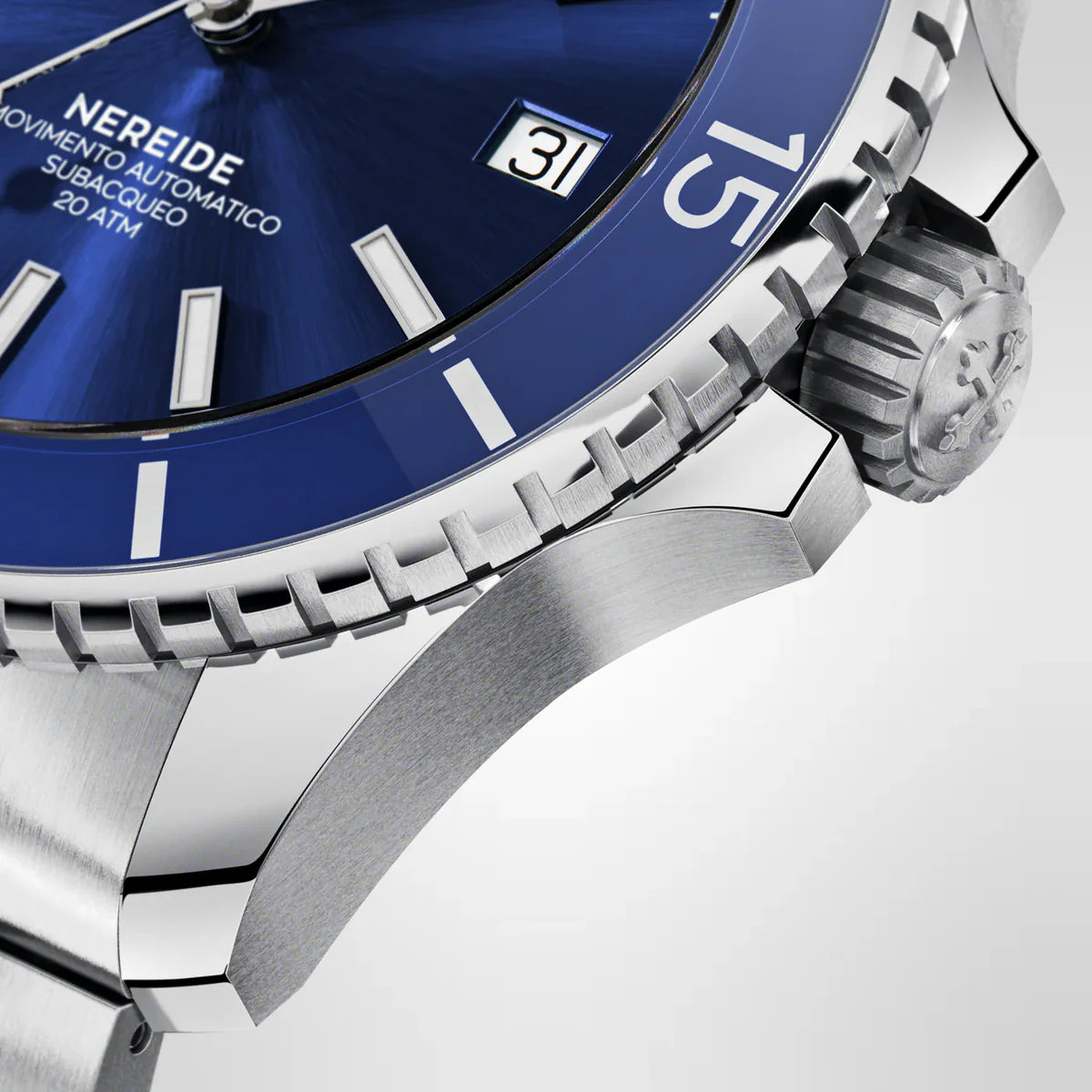 Our dive watch, water-resistant to a depth of 200 meters, takes its name from the Nereide submarine, a marvel of Venetian naval technology. This timepiece is engineered to endure strong stresses, making it particularly well-suited for water sports enthusiasts.