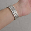 Sixteen different molds are required to manufacture this bracelet, whose design has been registered. The double finish, both glossy and satin, echoes that of the case and makes the central links stand out, providing elegance and balance. The butterfly clasp does not break the continuity of the design thanks to a perfect integration with the final central link.