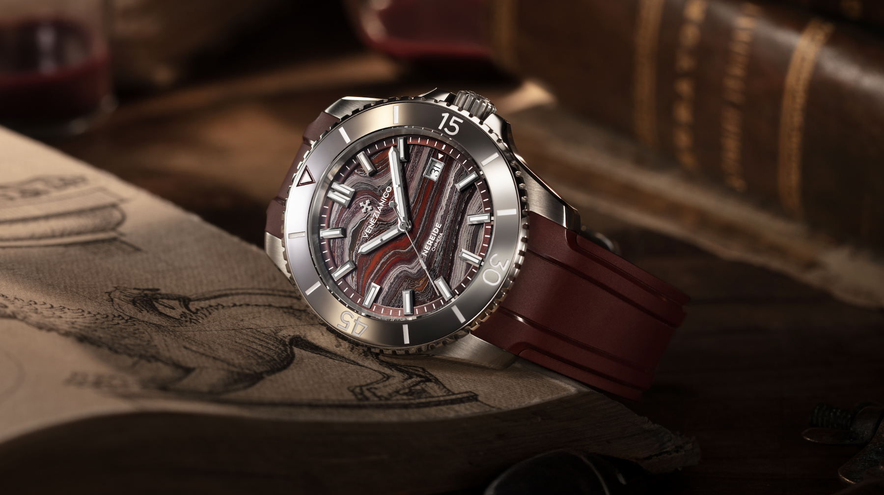 For this edition, we're introducing a new strap in FKM rubber, a high-performance technical material known for its resistance, stability, and comfort over time. Its structure ensures flexibility and durability, while the dark red hue echoes the dominant color of the stone and packaging, completing the project's color identity.