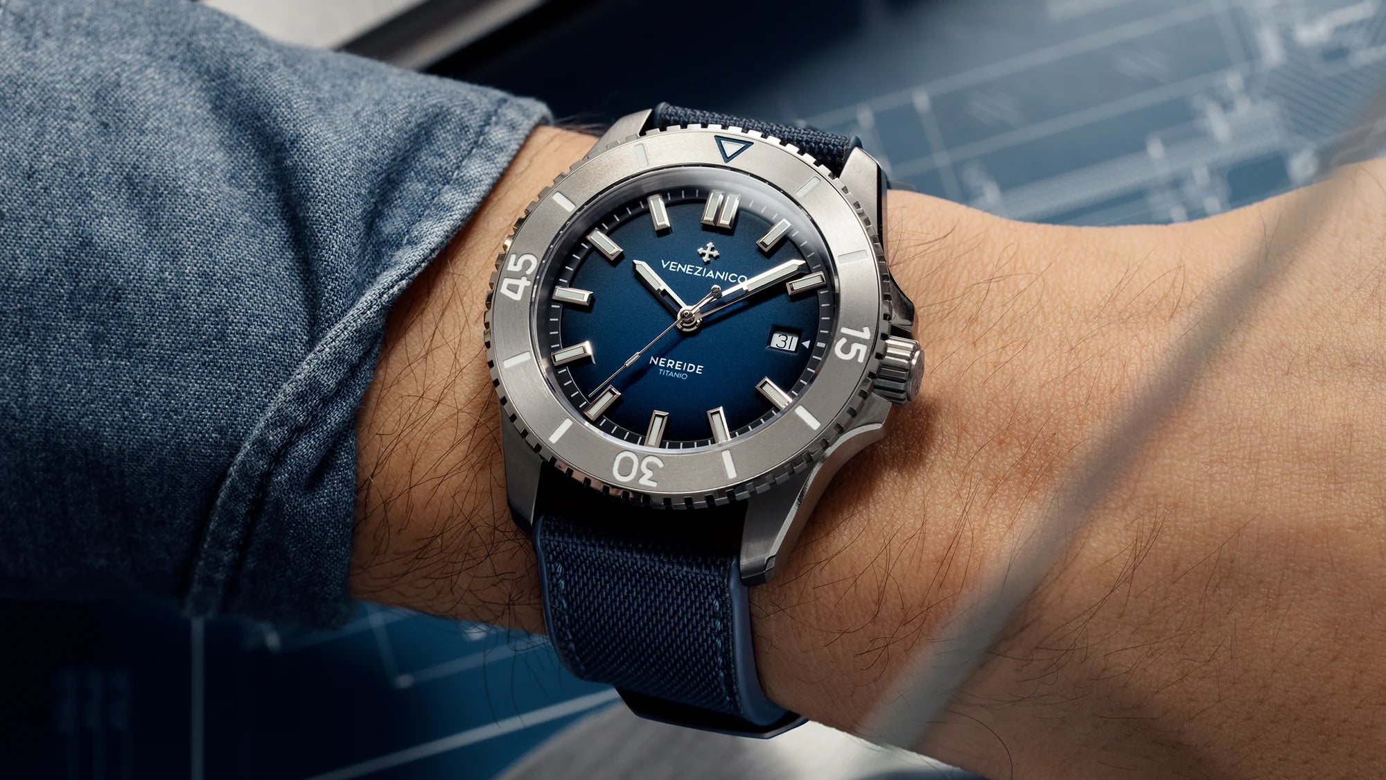The Nereide Titanium introduces a significant innovation: a hybrid strap made of waterproof textile fiber and FKM rubber, an extremely durable material that makes the watch suitable for any situation, even the most extreme. The buckle, also crafted in titanium, ensures aesthetic and functional consistency with the case.