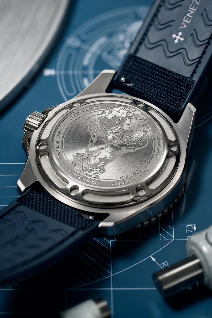 The screw-in case back of the Nereide Titanio ensures a water resistance of 30ATM (300m), combining durability with performance. Made from Grade 2 titanium, it features a finely engraved depiction of Atlas, the mythological Titan who inspired this model. The design is enhanced by a mix of sandblasted, satin, and polished finishes, adding depth and refinement, while the hypoallergenic properties of titanium ensure maximum comfort during wear.