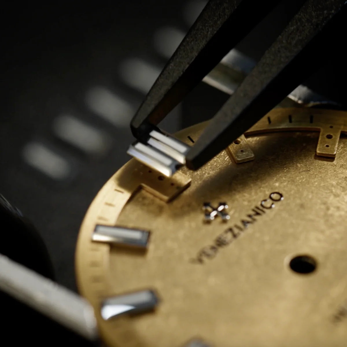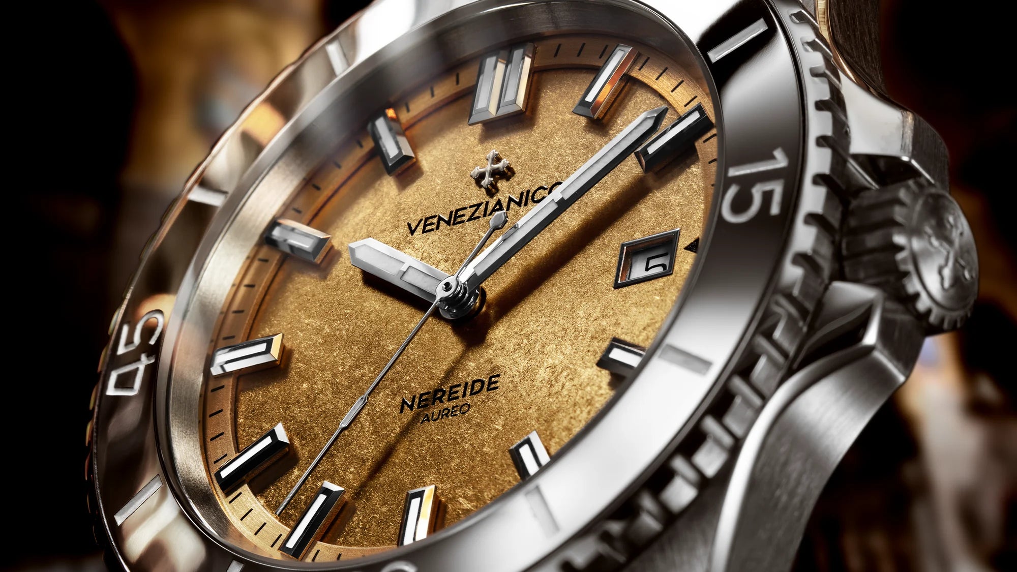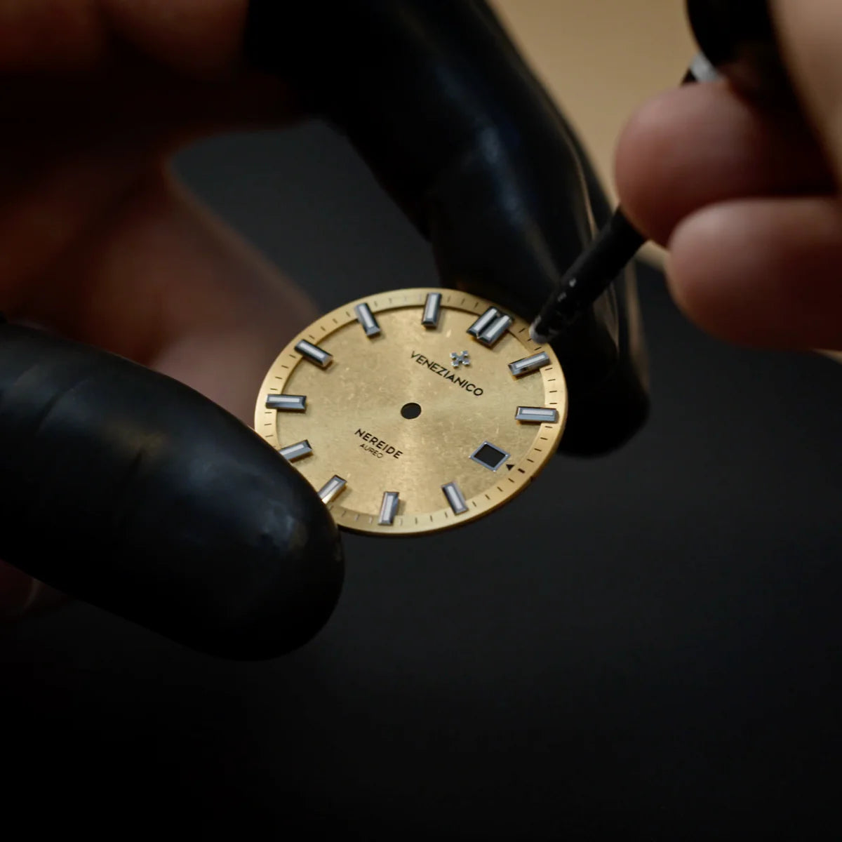 Wearing a watch with a gold-treated dial connects you to the opulence of Venetian artistry and the grandeur of the Serenissima Republic. Each glance recalls centuries of craftsmanship, where gold symbolized power and beauty. The rippled, radiant finish of the Nereide Aureo dial evokes the gilded mosaics of the Basilica of San Marco, celebrating Venice’s legacy of transforming precious materials into masterpieces.