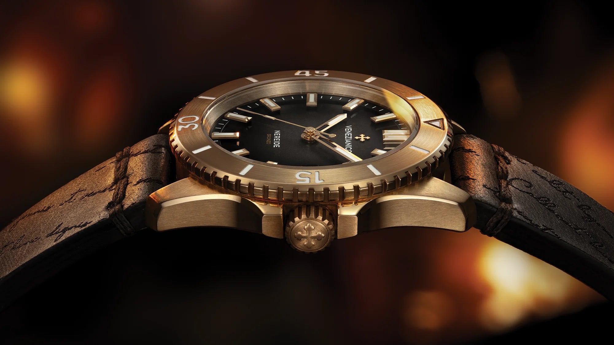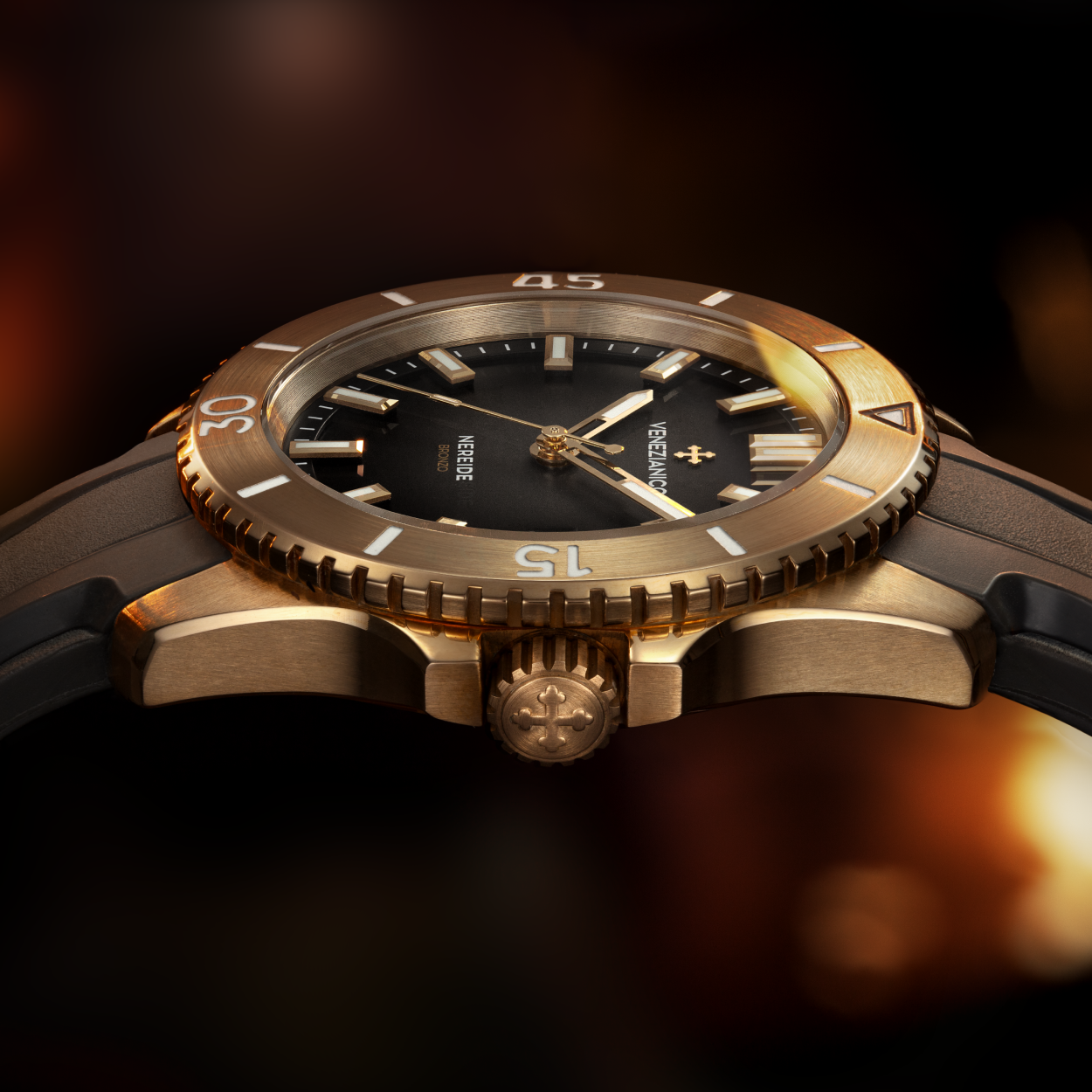 The connection with Venice permeates our research and design choices. Nereide Bronze pays homage to the artistic roots of the city, seamlessly blending ancient artisanal traditions with contemporary elements. The watch's case back depicts the majestic Bronze Horses of St. Mark, a tangible symbol of the profound link between the timepiece and Venetian history.