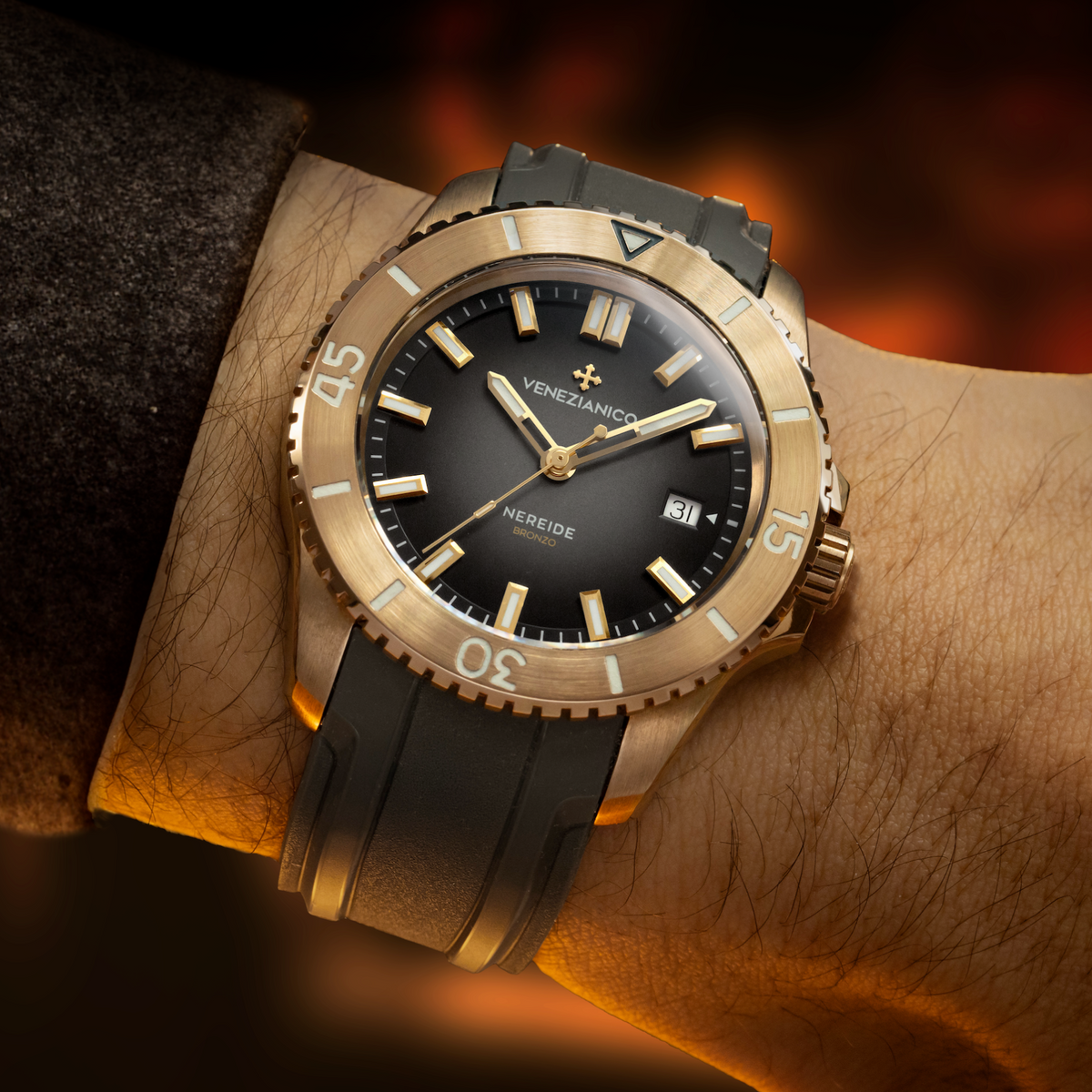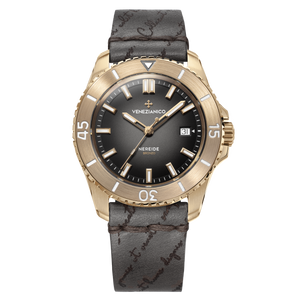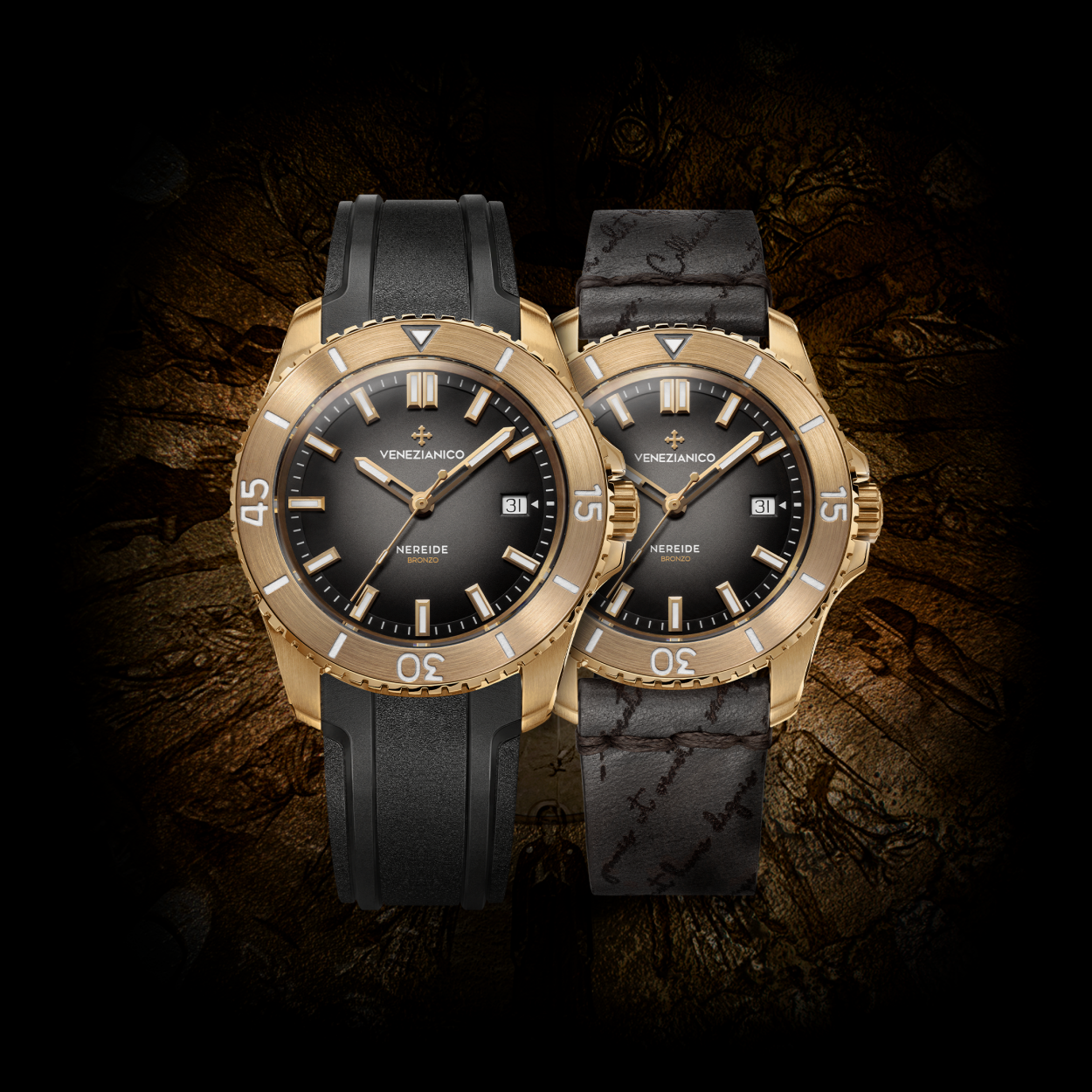 The Nereide Bronzo, inspired by the metal of the famous Horses of St. Mark, embodies the timeless charm of this material, an essential part of the history of Venetian craftsmanship. The case, carefully finished, evolves over time, developing a unique patina that tells endless stories.