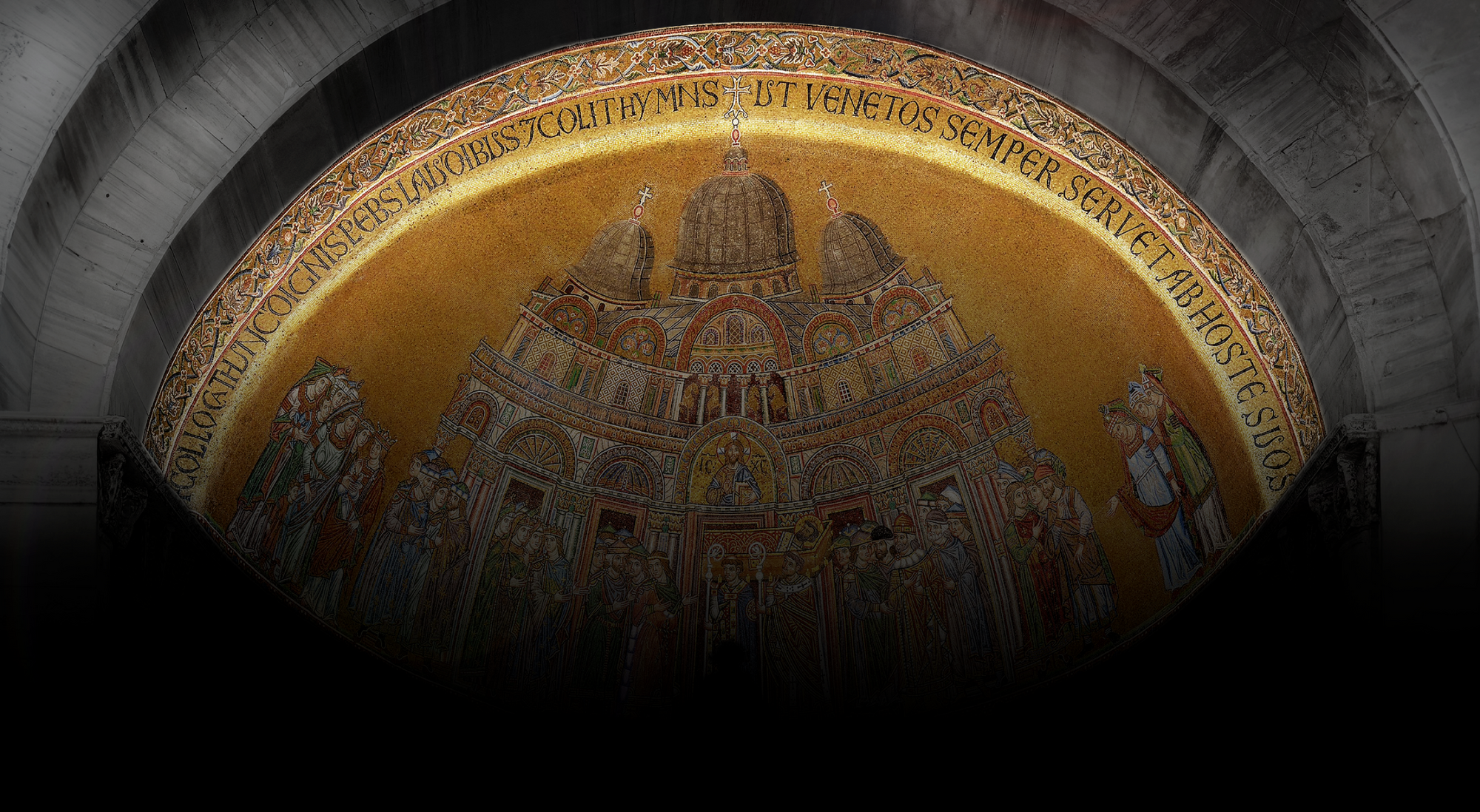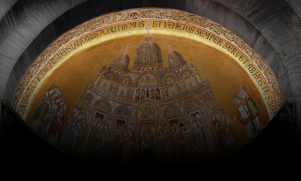 The oldest mosaic of St. Mark's, from the 13th century, depicts Doge Lorenzo Tiepolo's 1268 oath during the relic's transfer to the basilica. Flanked by the Horses of St. Mark, it features the Latin inscription, 'Collocat ung dignis plebs laudibus et colit hymnis ut venetos semper servet ab hoste suos' (Placed this relic for the praise and veneration of the people, to forever defend the Venetians). This phrase is engraved on the artisanal leather strap.