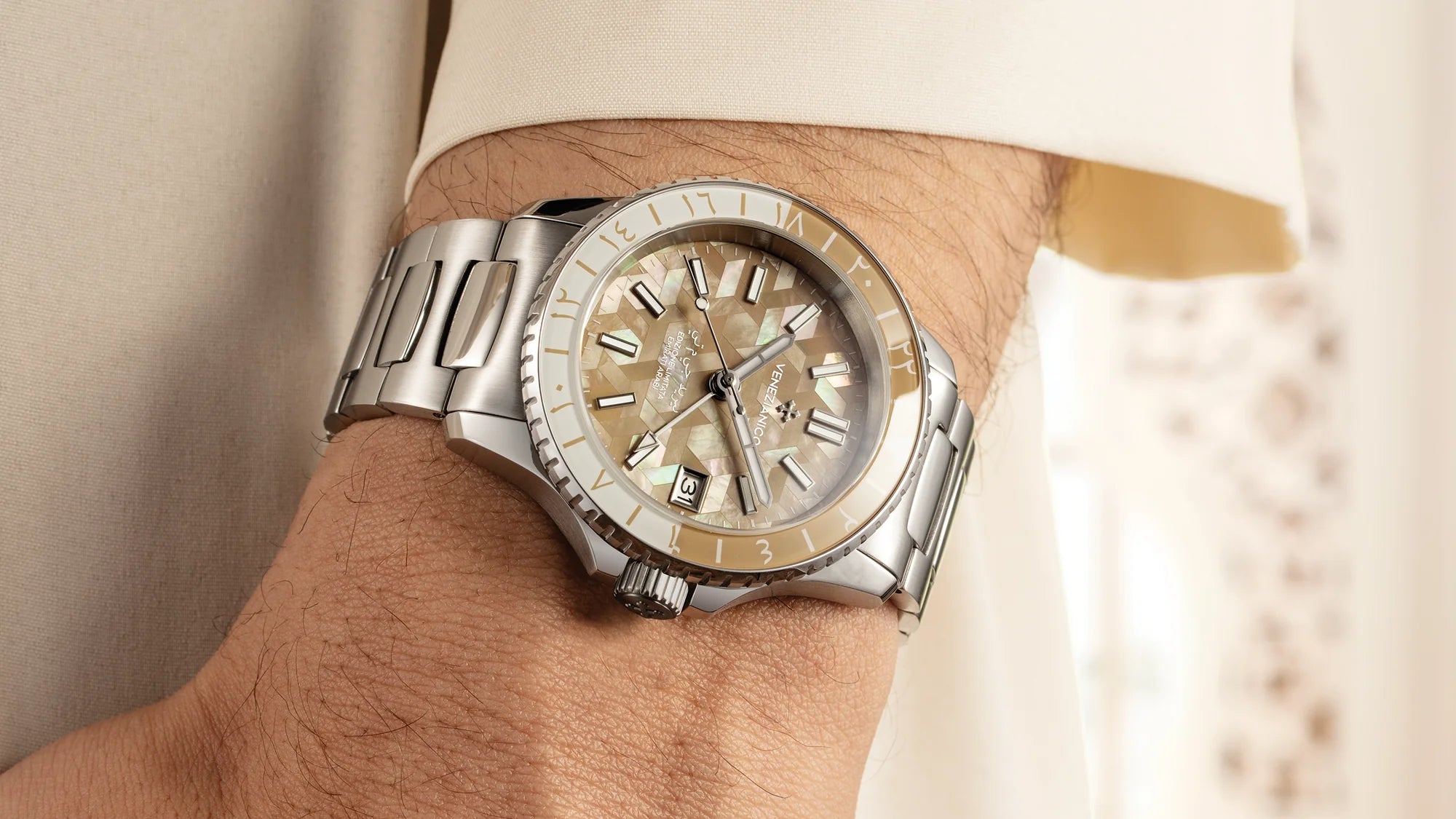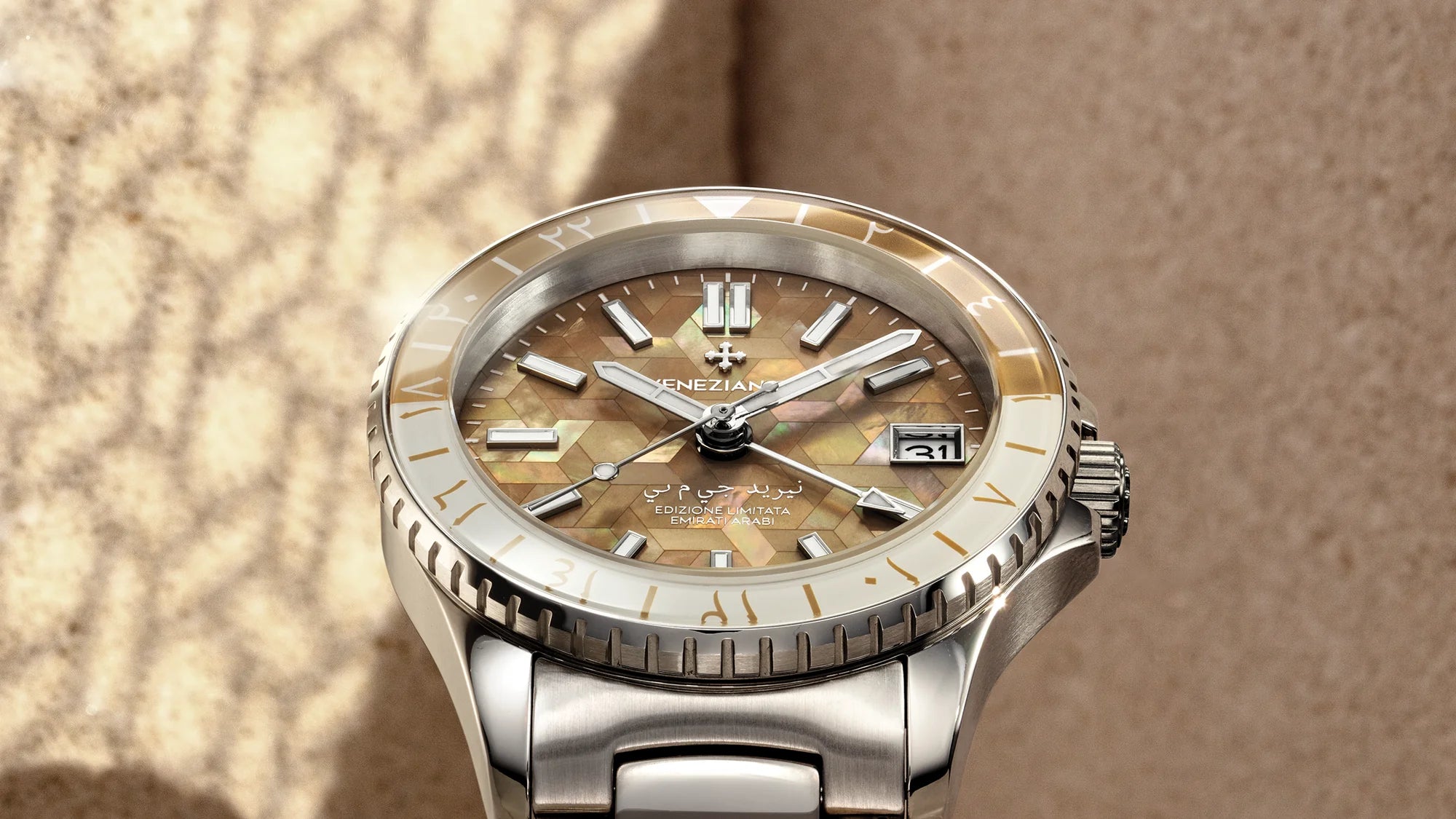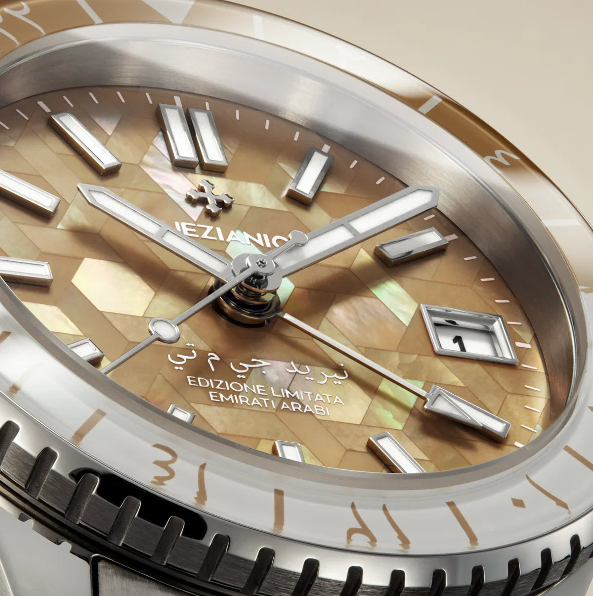 This concept celebrates the cultural exchanges between Venice and the United Arab Emirates, showcasing the nation's rich artistic heritage. Featuring a handcrafted mother-of-pearl mosaic dial with an arabesque pattern and Arabic numerals, this special edition embodies the elegance and craftsmanship of timeless traditions.