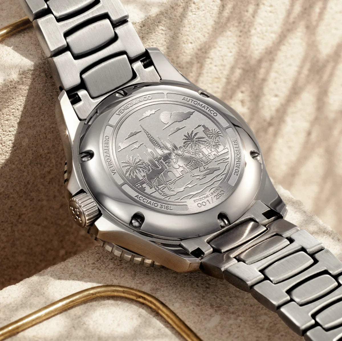 Our dive watch, water-resistant to a depth of 200 meters, takes its name from the Nereide submarine, a marvel of Venetian naval technology. This timepiece is engineered to endure strong stresses, making it particularly well-suited for water sports enthusiasts.
