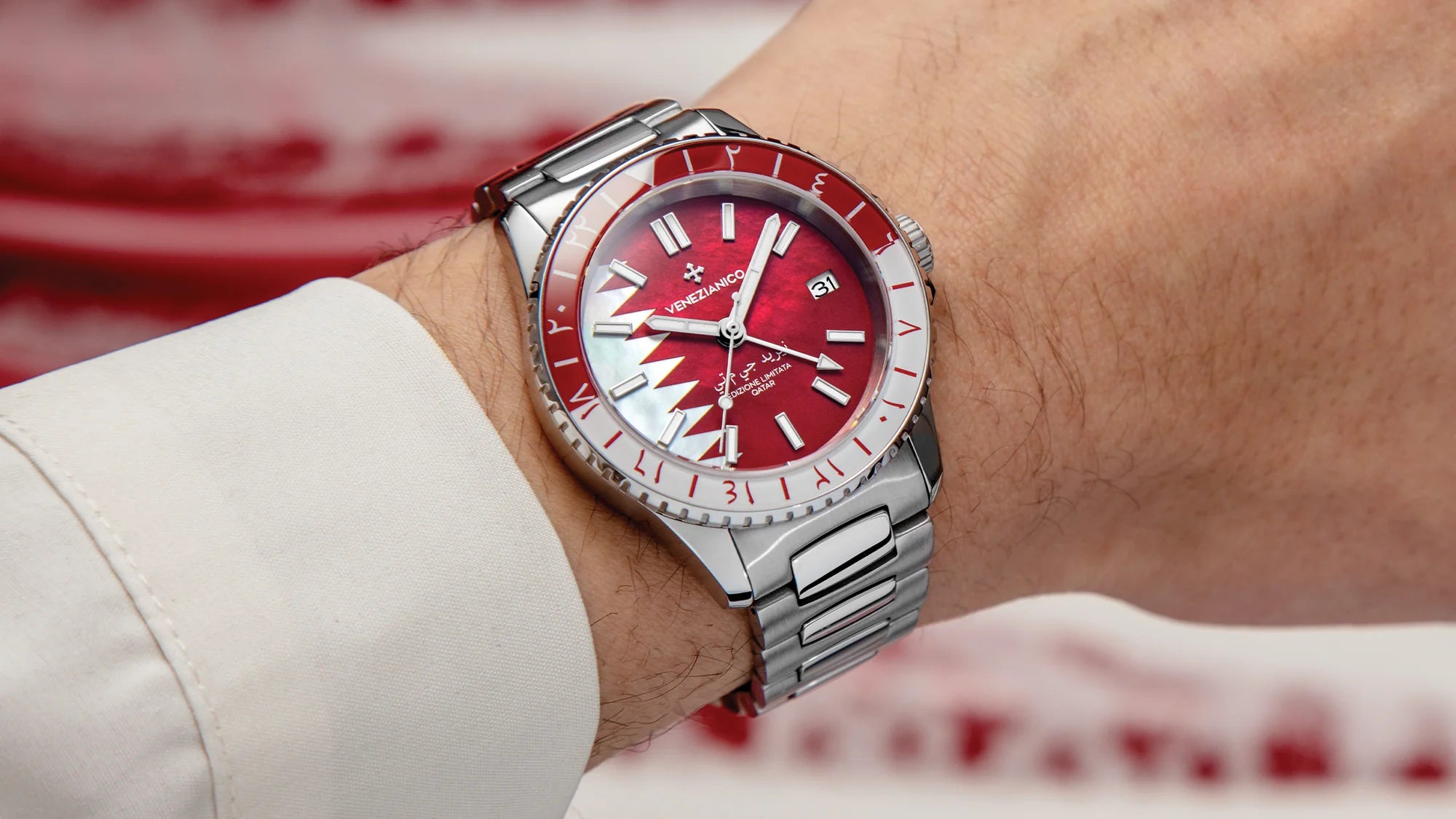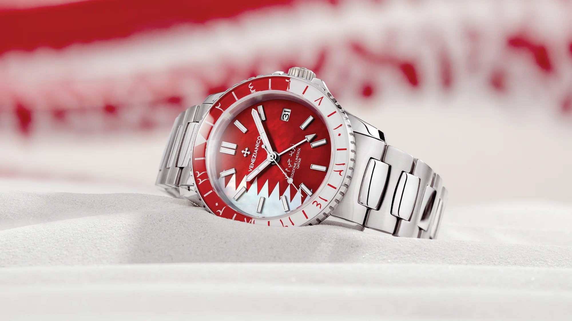The magical glare of mother-of-pearl enhances the depth and contrast of the two colors of the Qatari flag, white and red. A duality that repeats in the bezel, made of scratch-resistant BK7 glass, which features indices with Arabic numeral to underline the inspiration for this timepiece.