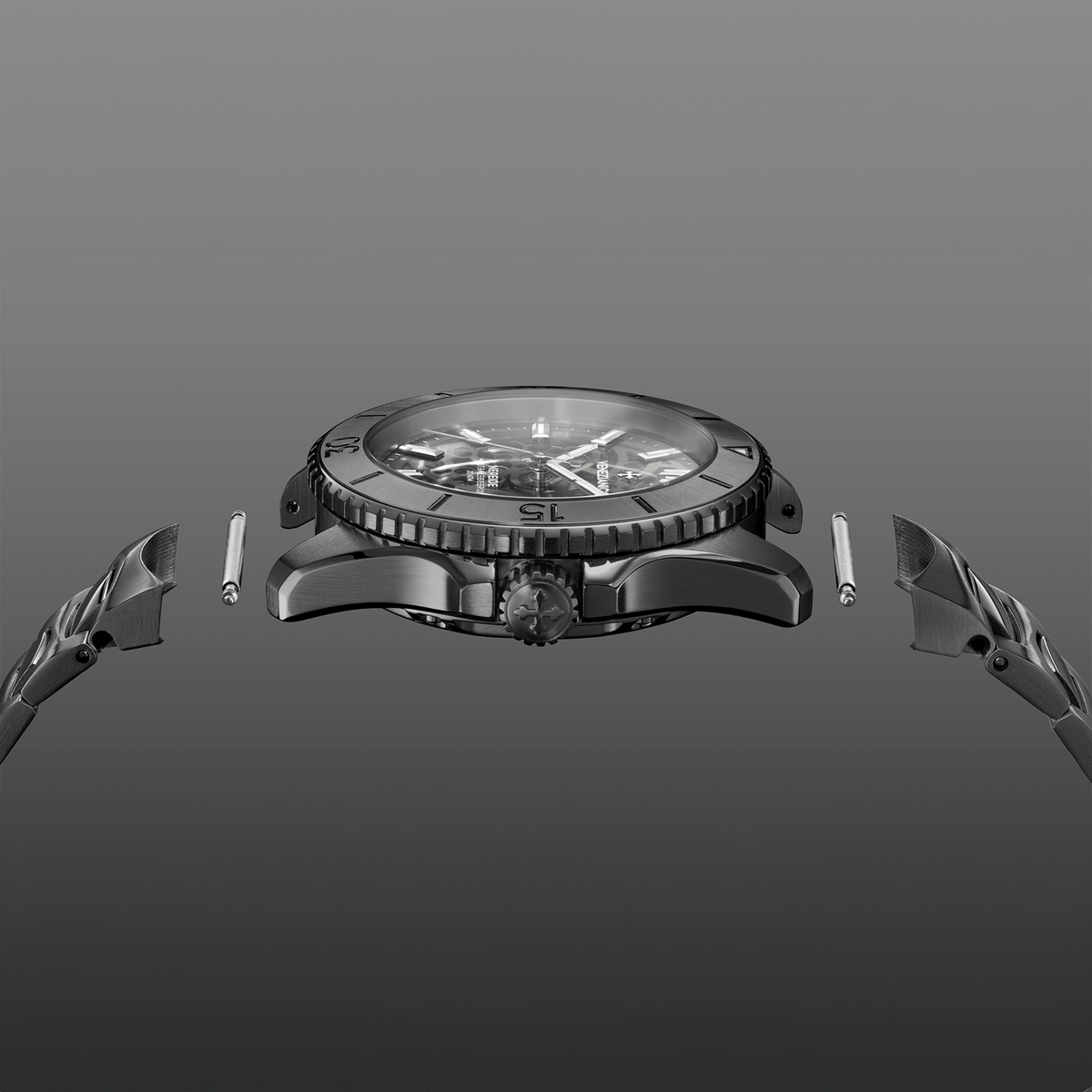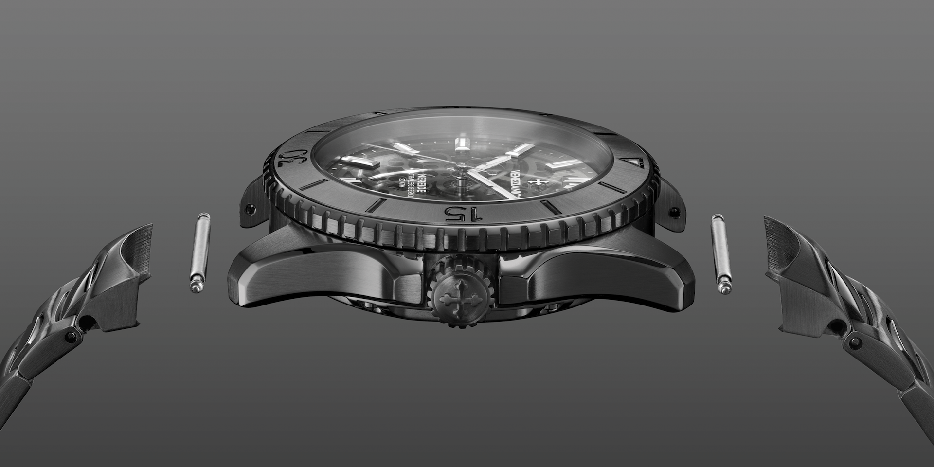 The style of Nereide Ultraleggero caseback is meant to evoke the complexity behind its design. This is achieved by alternating screws and grooves as well as by combining three different finishes: radial satin finish, micro-sandblasting and polishing.