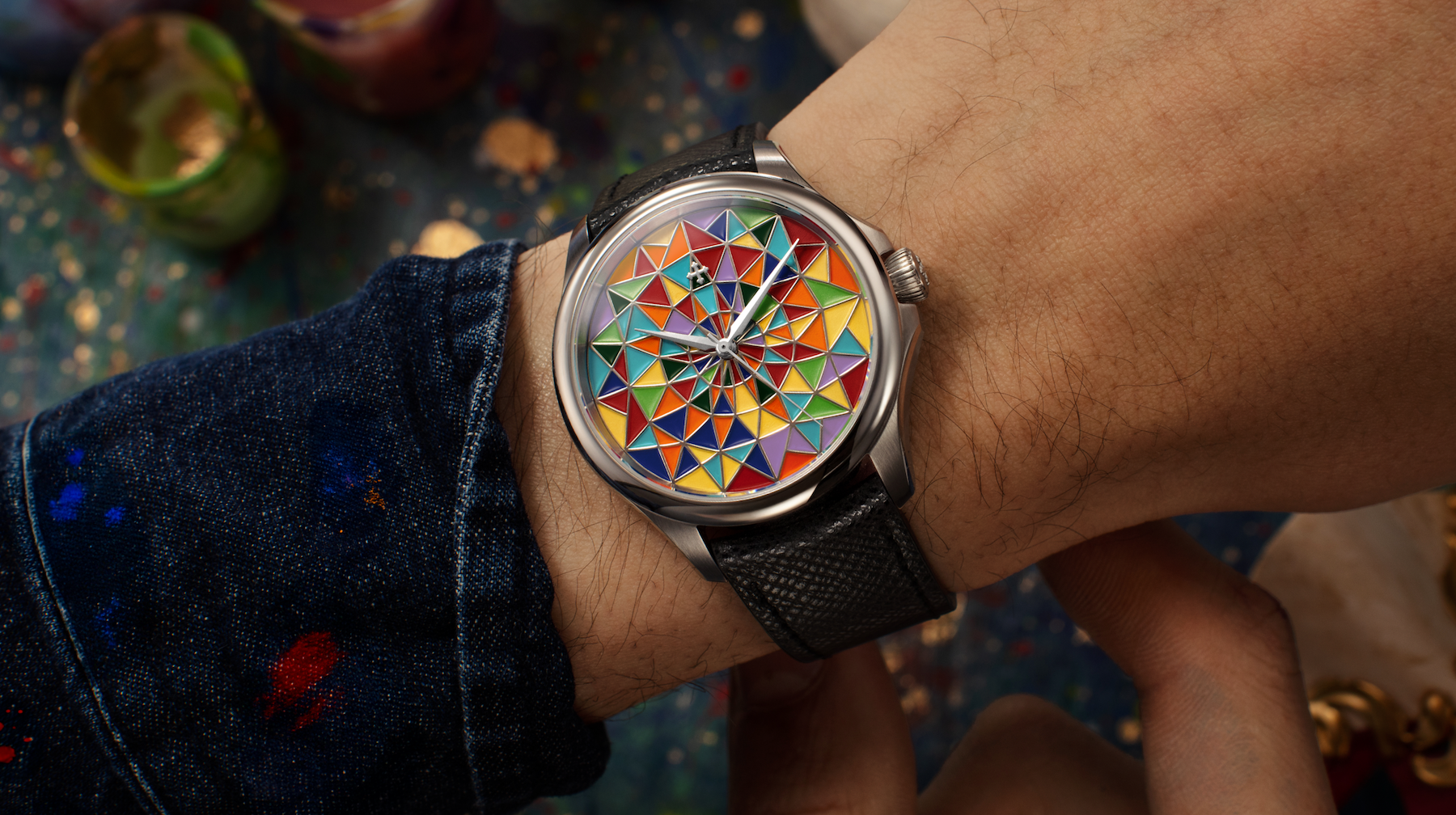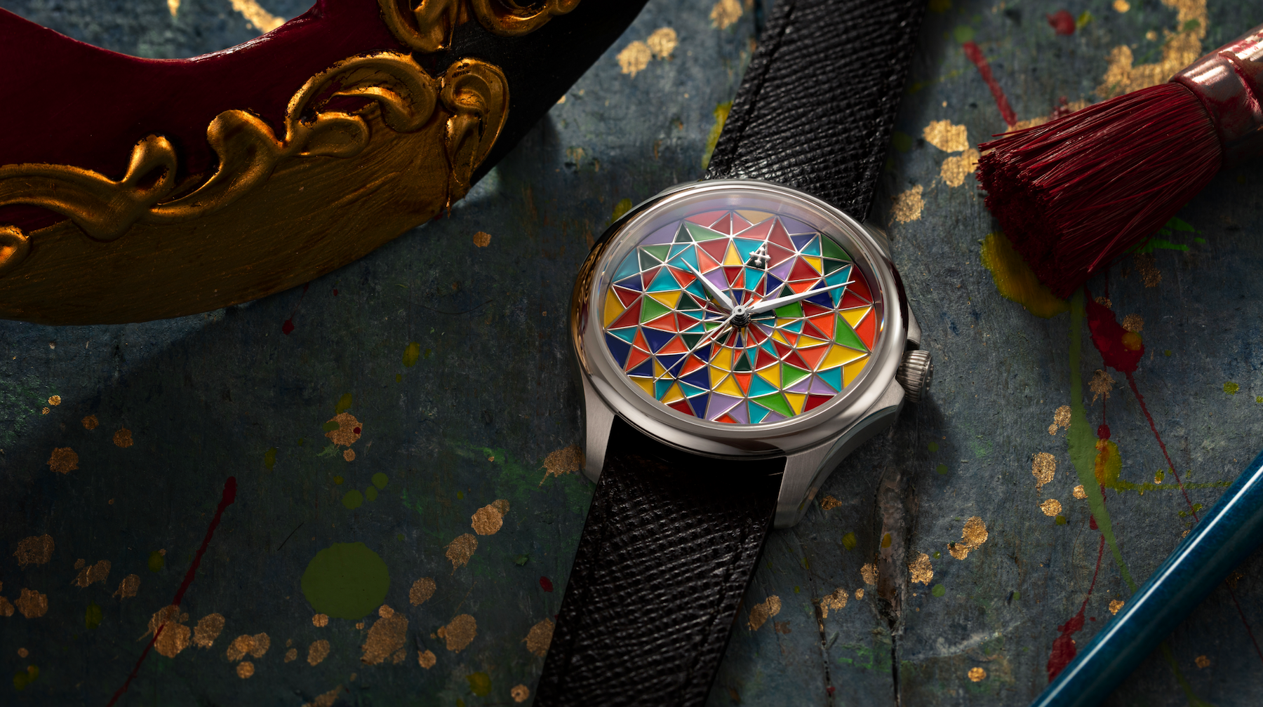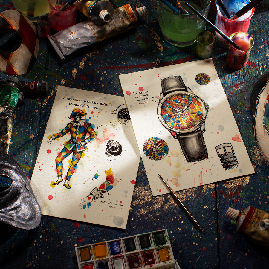 Redentore Arlecchino was born on paper, between color studies and sketches inspired by the costume of the most famous Venetian Carnival mask. The iconic geometric patches become the dial's sectors, organized in a precise structure that alternates enameled surfaces, sharp edges, and colored cells, creating an orderly and dynamic composition.
