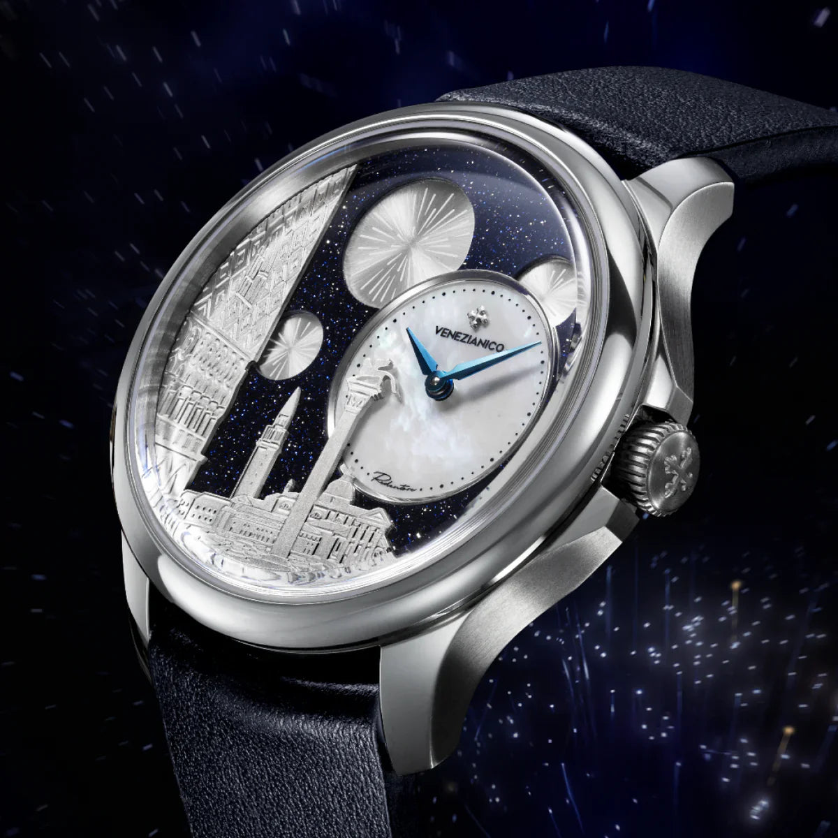 The structure of Redentore Bellanotte dial is highly complex, featuring four distinct levels. First, there is a starry sky made of aventurine, followed by a small off-center dial crafted from mother-of-pearl. Next, a satin-finished disc depicting fireworks is set, with a background showcasing a bas-relief of Palazzo Ducale and Basilica di San Giorgio Maggiore, both rhodium-plated. This intricate construction is made possible by the use of a micro-automatic movement with a diameter of only 17.55 mm, secured with a brass ring decorated with a perlage finish.