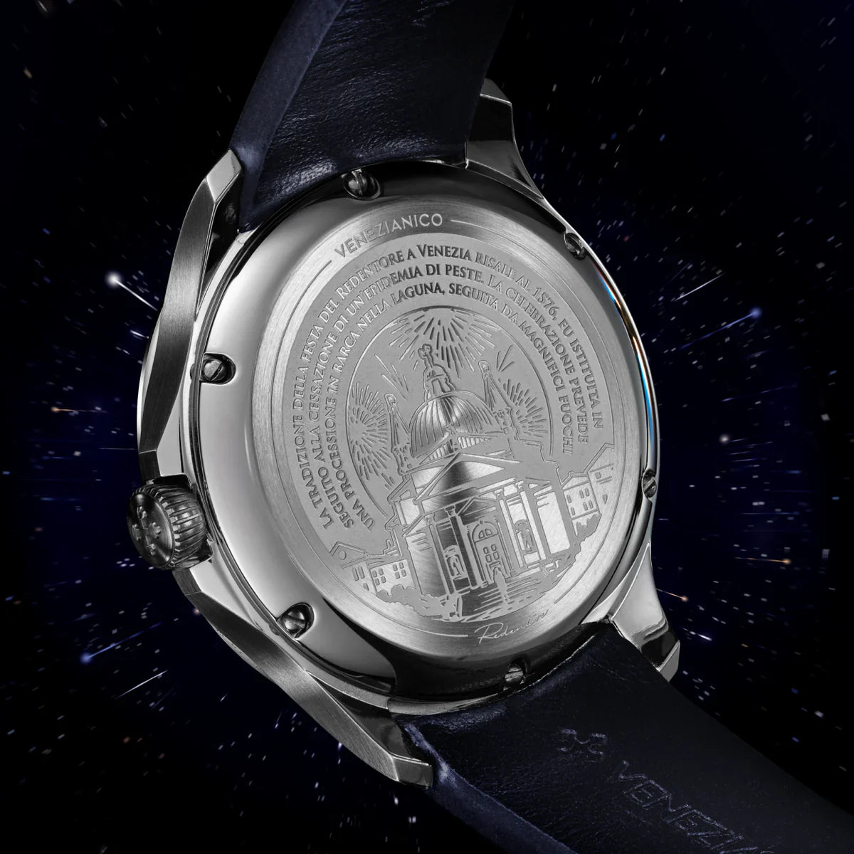 The Feast of the Redentore is an important celebration in Venice, commemorating the end of the plague in 1576 with boat bridges over the Grand Canal and spectacular fireworks. This lively tradition is captured in the caseback of Redentore Bellanotte watch, depicting the Basilica of the Redeemer and the fireworks lighting up the night sky. The detailed engraved design, accompanied by an explanation, pays homage to the festival, transforming the watch into a symbol of the traditions and beauty of the lagoon city.