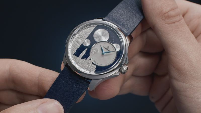One of the most distinctive features of Redentore Bellanotte is its off-center dial. Typically reserved for high-end watches, this design element adds a touch of sophistication and originality. In this particular instance, the off-center dial is crafted from white mother-of-pearl, an iridescent material that symbolizes the moon, delicately framed by a polished steel ring. This layout separates the mother-of-pearl from the rest of the design, which depicts St. Mark's Square during the enchanting Redentore night.